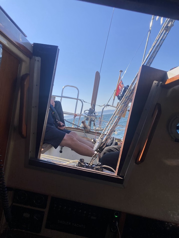 Lladudno to Great Burbo Flats we weighed anchor shortly after 0900 which gave us favourable tide until around 1400 though for the first hour had to motor due to the continued absence of any wind. The wind then started to pick up from an easterly direction and we close hauled up the coast. It was fantastic, Trivial Pursuit dug her shoulder in and was off. She was in her element with a very comfortable motion through the short chop. This also gave the opportunity to use the Aries Wind Vane, I have watched these on YouTube but never seen one in action. All I can say is that this is a fantastic bit of kit. Having set the course to steer the wind vane then holds the course to the wind. This is then adjustable via a ratchet mechanism by increments of 6° to either port or starboard.